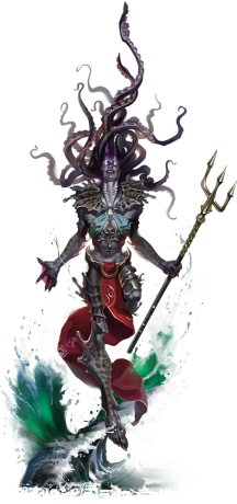 Трезубец. Рукопашная атака оружием: +14 к попаданию, досягаемость 10 футов, одна цель. Попадание: 18 (3к6 + 8) колющего урона или 21 (3к8 + 8) колющего урона при использовании двумя руками, плюс 13 (3к8) урона электричеством.