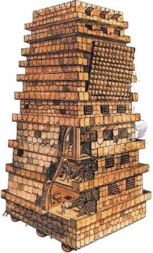 - Осадная башня это передвижное деревянное сооружение из балок с трапами в одной стене. Большие деревянные колёса или ролики позволяют солдатам или животным тянуть её или толкать.