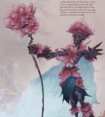 С исхудалыми лицами, угольной кожей и грубыми пунцовыми лепестками, ханамори - раса разумных растений, которых многие считают предвестниками смерти. Эта репутация небезосновательна, ведь ханамори обладают физиологической симпатией: их тела созвучны мимолетному духу существ, умирающих в их присутствии, и на короткое время принимают черты умершего. Убийство могучего зверя ощущается охотниками как прилив физической силы, а кончина мудреца - как трансцендентный момент обостренной мудрости. В результате у ханамори сложные отношения со смертью; умереть в их присутствии - значит на короткое время передать другому частицу себя.